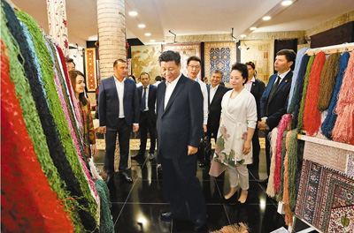 習(xí)近平和彭麗媛走進波依卡揚建筑群旁的一家地毯和絲綢作坊。紡織女工們正在制作布哈拉傳統(tǒng)手工地毯,用嫻熟的技藝織成色彩斑斕的圖案。 王滬寧、栗戰(zhàn)書、楊潔篪等陪同參觀。 |