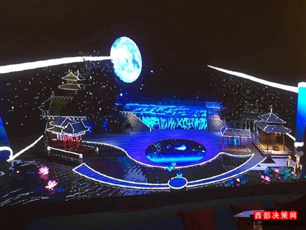 今年秋晚的舞美設(shè)計(jì)制作本著厲行節(jié)約的原則,對演播現(xiàn)場現(xiàn)有的實(shí)景建筑做了最大化的利用。晚會以中國目前最大的仿唐建筑群紫云樓為觀眾席背景,在廣場一側(cè)的人工景觀湖上搭建舞臺。舞臺主體通過一幅展開的中國傳統(tǒng)畫軸形象,將西安城墻和大明宮角樓等元素有機(jī)地結(jié)合到一起,實(shí)現(xiàn)臺在水上、水在臺中的夢幻效果,營造出一種穿越千年、貫通古今的浪漫。