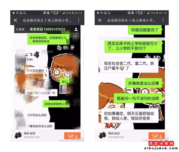 近日,一則題為《延安微信招生(3.2萬保上新城小學(xué))請(qǐng)相關(guān)部門給予調(diào)查公布真相》的帖子在朋友圈瘋傳,內(nèi)容是一位微信名叫“延安微信招生(保上新城小學(xué))”的微友,聲稱只要花3.2萬元,保證可以在新區(qū)小學(xué)入學(xué),并解釋有中間人,錢并不是直接給校長王紅霞,但愿意提供自己的車號(hào)、身份證號(hào)、家庭住址等信息作為擔(dān)保。3.2萬真的能夠保上延安新區(qū)小學(xué)嗎?事情真相究竟如何,記者展開調(diào)查。