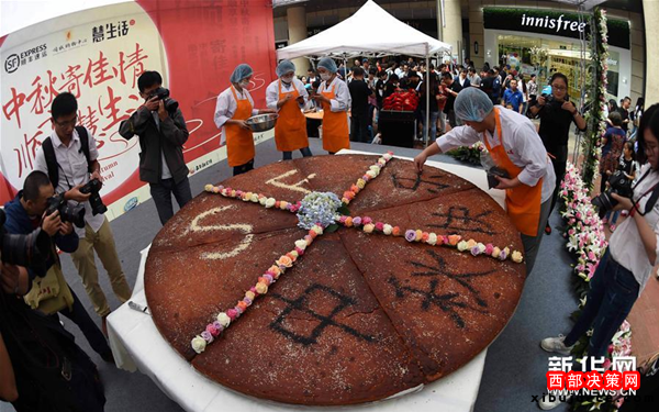 2016年9月3日,在云南昆明一購物中心展出了一個直徑約2.4米的巨型月餅。這個巨型月餅是以火腿、食用玫瑰等材料純手工制作而成,總重量達(dá)上百斤。