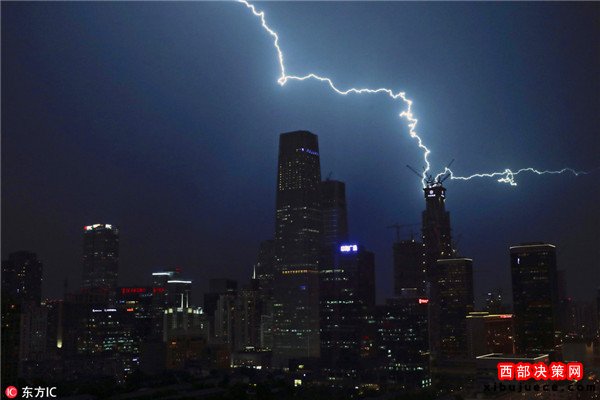 2016年9月7日,中國北京,夜幕降臨,一道道打雷閃電劃破京城夜空,觸目驚心。據北京市氣象局官方微博消息,北京市氣象臺7日17時45分發(fā)布雷電黃色預警信號。