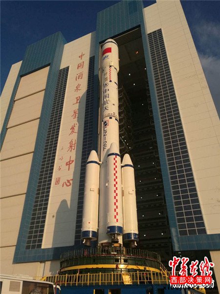 圖為長征二號F T2運載火箭與天宮二號空間實驗室的垂直轉運。