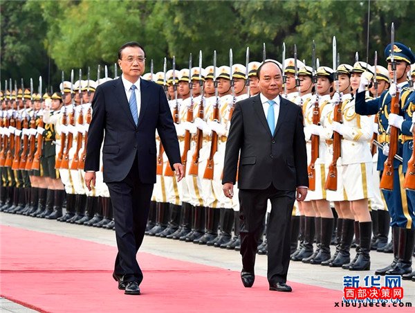 會(huì)談前,李克強(qiáng)在人民大會(huì)堂東門外廣場(chǎng)為阮春福舉行歡迎儀式。