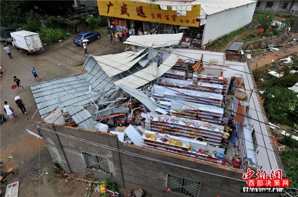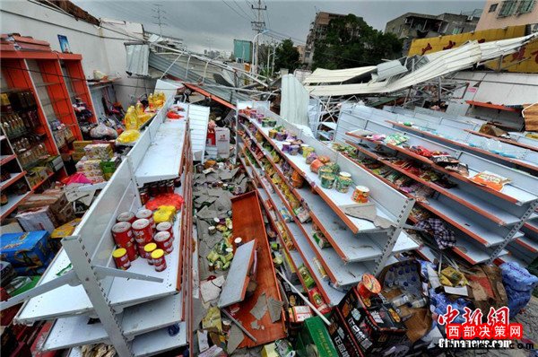 9月15日,今年第14號(hào)臺(tái)風(fēng)“莫蘭蒂”于凌晨3時(shí)05分在廈門(mén)翔安區(qū)沿海登陸,登陸時(shí)中心附近最大風(fēng)力15級(jí)(48米/秒,強(qiáng)臺(tái)風(fēng)級(jí)),中心氣壓945百帕,給翔安當(dāng)?shù)貛?lái)嚴(yán)重?fù)p失。圖為翔安一超市被摧毀。
