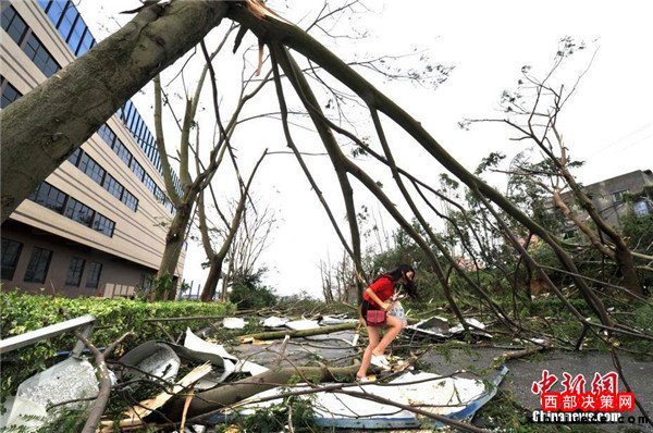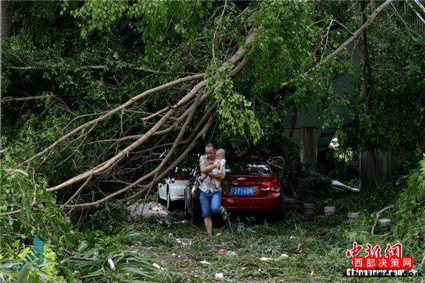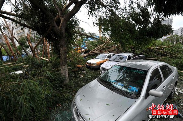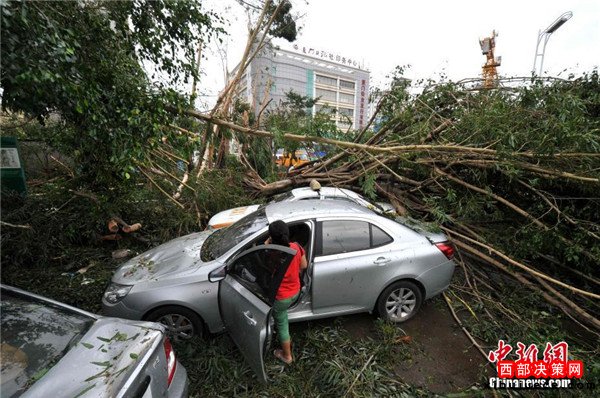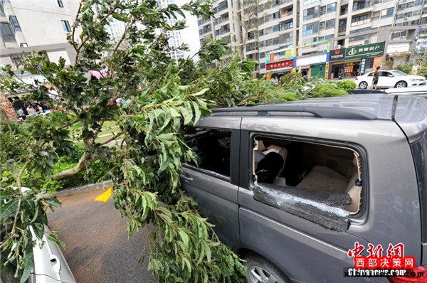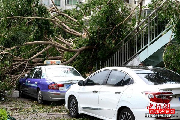9月15日,今年第14號(hào)臺(tái)風(fēng)“莫蘭蒂”于凌晨3時(shí)05分在廈門(mén)翔安沿海登陸,登陸時(shí)中心附近最大風(fēng)力15級(jí)(48米/秒,強(qiáng)臺(tái)風(fēng)級(jí)),中心氣壓945百帕。圖為廈門(mén)市區(qū)大批車(chē)輛被吹倒的樹(shù)木損壞。