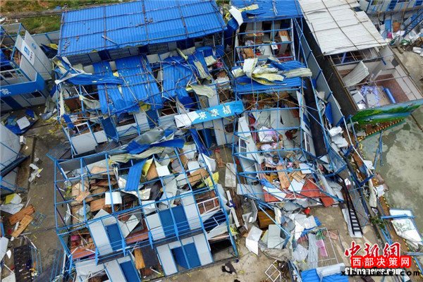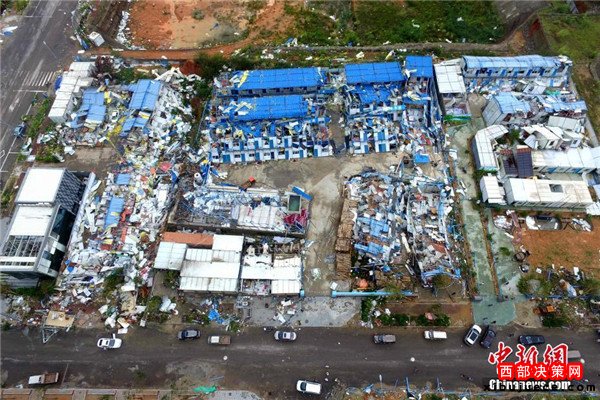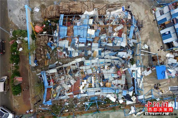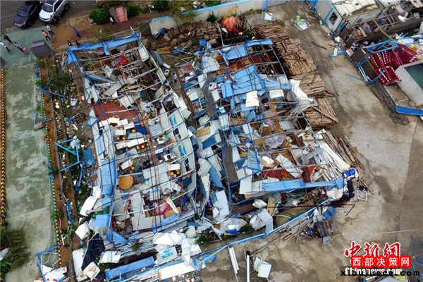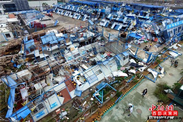 9月15日,今年第14號(hào)臺(tái)風(fēng)“莫蘭蒂”于凌晨3時(shí)05分在廈門(mén)翔安沿海登陸,登陸時(shí)中心附近最大風(fēng)力15級(jí)(48米/秒,強(qiáng)臺(tái)風(fēng)級(jí)),中心氣壓945百帕。圖為航拍登陸點(diǎn)翔安一工地工棚被完全摧毀。