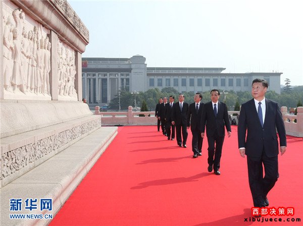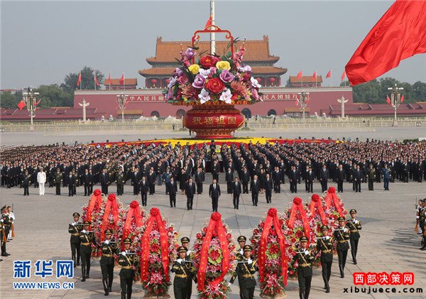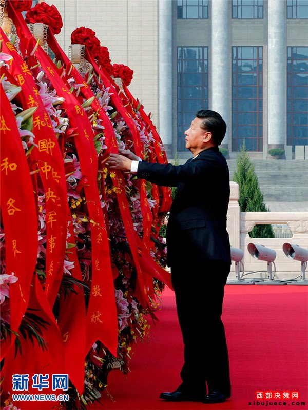 9月30日上午,黨和國家領(lǐng)導(dǎo)人習(xí)近平、李克強(qiáng)、張德江、俞正聲、劉云山、王岐山、張高麗等來到北京天安門廣場(chǎng),出席烈士紀(jì)念日向人民英雄敬獻(xiàn)花籃儀式。這是習(xí)近平整理花籃上的緞帶。新華社記者鞠鵬攝