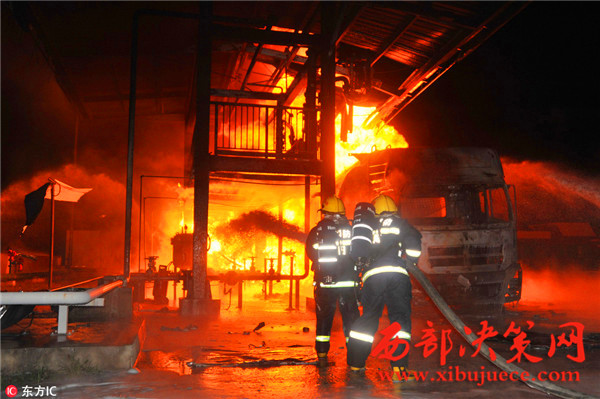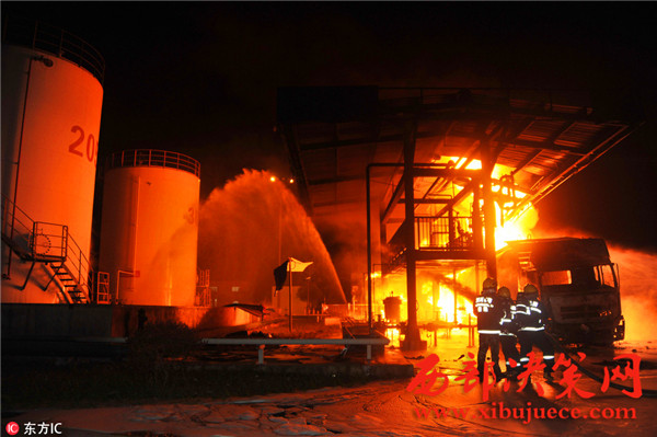 據了解,事故發(fā)生油罐區(qū)占地約40畝,主要生產航空汽油,油罐區(qū)共有油罐10個,油罐內裝有原料及航空汽油約300余噸,發(fā)油平臺往罐車內輸送航空汽油時突然發(fā)生火災,燒毀發(fā)油平臺及油罐車等,著火油罐車儲量30噸,著火時車內汽油約10噸,過濾器中有油約7噸,共計約17噸燃油,離鄰近儲油罐約30米。