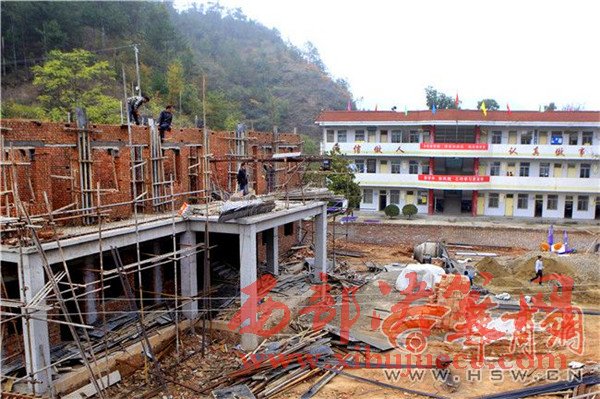 10月20日上午,在山陽縣高壩店鎮(zhèn)石橋村小學,偌大的操場中間用一堵墻隔成兩半,一半是學生活動場所,另一半是一棟剛剛建設的村委會辦公樓。學校的一、三樓用于村委會、教職工辦公休息,二層學生上課。