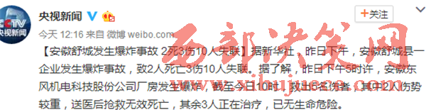 新聞中心官方微博今日消息稱,據(jù)新華社,昨日下午,安徽舒城縣一企業(yè)發(fā)生爆炸事故,致2人死亡3傷10人失聯(lián)。據(jù)了解,昨日下午5時許,安徽東風機電科技股份公司廠房發(fā)生爆炸,截至今日10時,救出5名傷者,其中2人傷勢較重,送醫(yī)后搶救無效死亡,其余3人正在治療,已無生命危險。