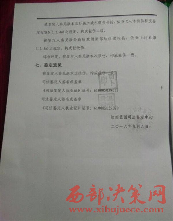 秦見康的出院證明和陜西藍(lán)圖司法鑒定中心的鑒定結(jié)果。秦見康供圖秦見康向澎湃新聞提供的中國人民解放軍第四軍醫(yī)大學(xué)唐都醫(yī)院的出院證明顯示,秦見康7月21日住院,8月9日出院,醫(yī)院診斷結(jié)果顯示其右眼眶壁骨折,右眼限制性斜視,右眼鈍挫傷。陜西藍(lán)圖司法鑒定中心的鑒定結(jié)果顯示,秦見康構(gòu)成輕傷一級。