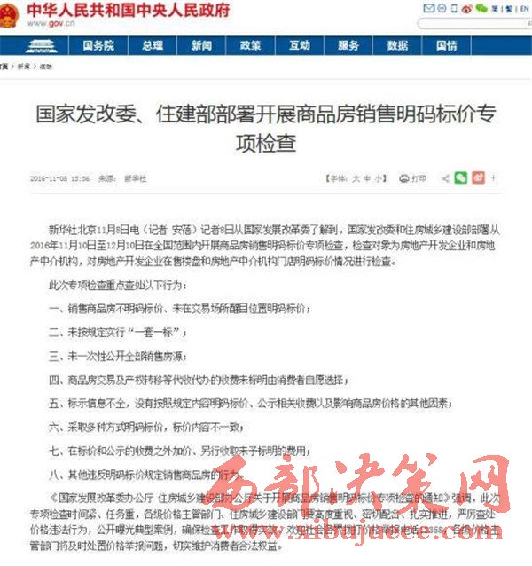 近日,國家發(fā)改委及住建部聯(lián)合發(fā)布了對商品房“明碼標價”的新一輪整治措施。部署從2016年11月10日至12月10日在全國范圍內開展商品房銷售明碼標價專項檢查。此次專項檢查重點查處以下八類行為。“明碼標價”、“一套一標”、“醒目”、“自愿”、“一致”成為重點關鍵詞。