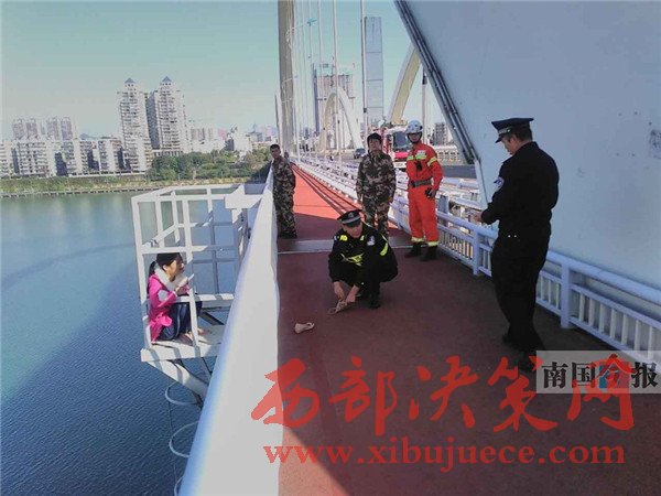 27日下午,柳州市廣雅大橋中段,有一名女子因感情問題想不開,翻越護欄想要輕生,民警和消防官兵趕到現(xiàn)場,經(jīng)過2個多小時的努力,終于抓住機會將其救下。