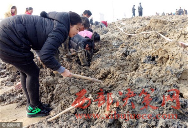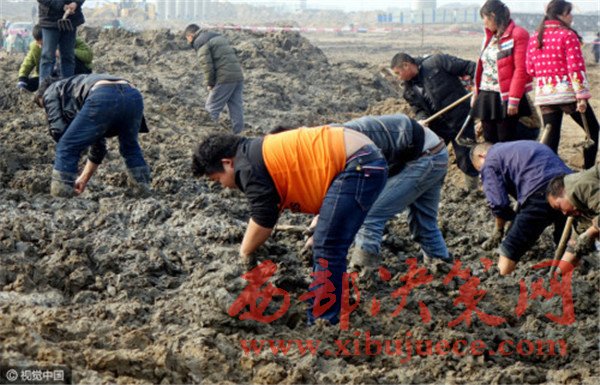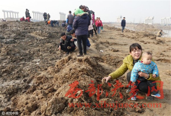 12月1日上午,記者在現(xiàn)場(chǎng)看到,幾十米寬的賈魯河兩岸,聚集了近百名村民,坑坑洼洼河灘上都是淤泥。村民們穿著膠鞋把淤泥抓在手里,尋找著里面的“寶貝”。