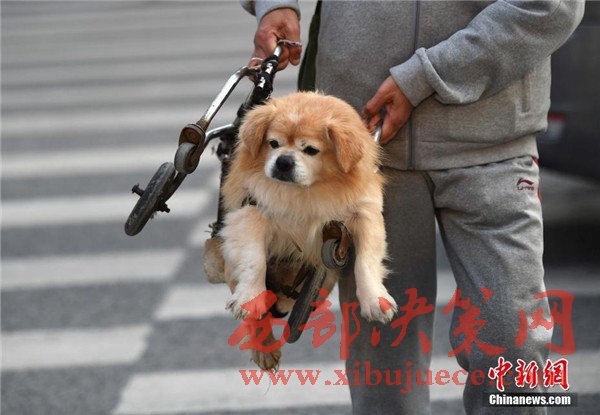 12月6日,重慶街頭一只半身殘廢的小狗依靠輪椅行走,吸引不少路人目光。