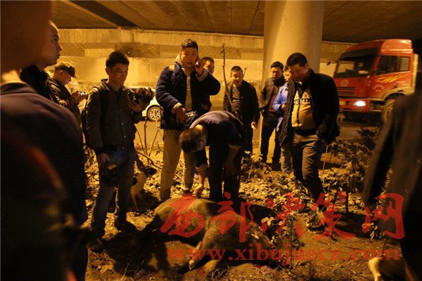 19:15,再次發(fā)現(xiàn)野豬蹤跡,它被狗攆著跑出了區(qū)政府大院,鉆到附近高速路橋下涵洞里。人群正準(zhǔn)備再次抓捕,一輛白色別克轎車駛過,“二師兄”被撞出十多米遠(yuǎn),這下再?zèng)]起來。