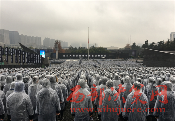 12月13日,十時(shí)整,雨中,南京大屠殺死難者國(guó)家公祭儀式在南京大屠殺遇難同胞紀(jì)念館隆重舉行。8000人冒雨參加了公祭,向30萬(wàn)遇難同胞致哀,場(chǎng)面莊嚴(yán)肅穆。國(guó)家公祭儀式從上午10點(diǎn)正式開始,南京全城鳴笛致哀。