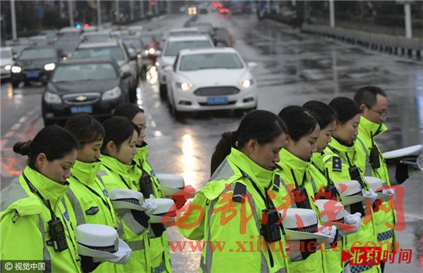 在南京市中心新街口,十點(diǎn)整,隨著凌厲尖銳的防空警報(bào)在南京上空拉響,往日熙攘熱鬧的新街口變得靜止。車輛緩緩?fù)W。鲃?dòng)鳴笛致哀1分鐘。行色匆匆的路人也停下腳步在寒風(fēng)中低頭默哀。此刻,所有人共同緬懷在南京大屠殺中死難的同胞。