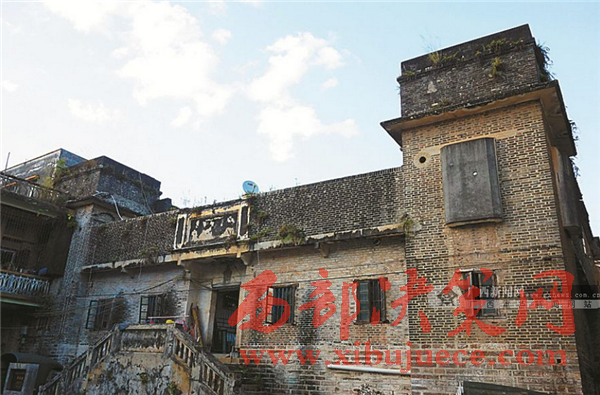 在教育路第一小學(xué)對面一座大院里,果然立著一棟形如圍屋的方形磚樓,氣派的門樓,圍墻四角高聳的碉樓,均顯示著主人當(dāng)年顯赫的身世。
