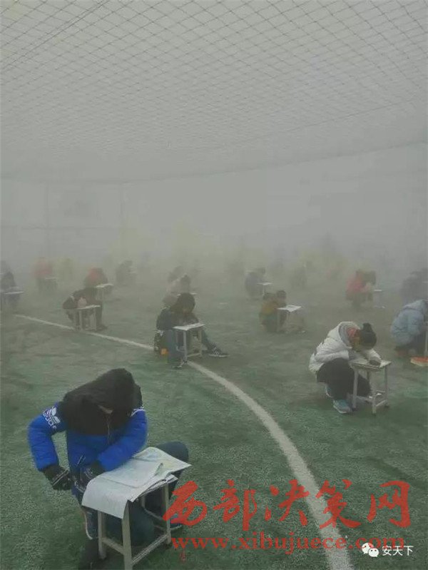 投訴人閆先生給記者發(fā)來(lái)兩張照片,照片顯示,天氣灰蒙蒙的,在一個(gè)露天的足球場(chǎng)上,很多學(xué)生半蹲著趴在凳子上做卷子,由于霧霾太大,第2排后面的學(xué)生身影已經(jīng)很模糊。20日下午3時(shí)50分左右,大河報(bào)記者趕到林州,當(dāng)?shù)氐目諝忪F霾十分嚴(yán)重,能見(jiàn)度只有二三百米。在臨淇鎮(zhèn)一中學(xué)校附近,記者見(jiàn)到了閆先生。他告訴記者,現(xiàn)在學(xué)校已經(jīng)知道記者要來(lái)采訪了,臨時(shí)放假了,考試也取消了。隨后,在校門(mén)口,該校八年級(jí)的一名學(xué)生告訴記者,學(xué)校確實(shí)確實(shí)在12月19日考試了,上午考英語(yǔ)和數(shù)學(xué),下午考語(yǔ)文和物理。該學(xué)生告訴記者,八年級(jí)共十個(gè)班,每個(gè)班六七十人,大家都參加了考試,“在操場(chǎng)上考的,搬著凳子在外面”。