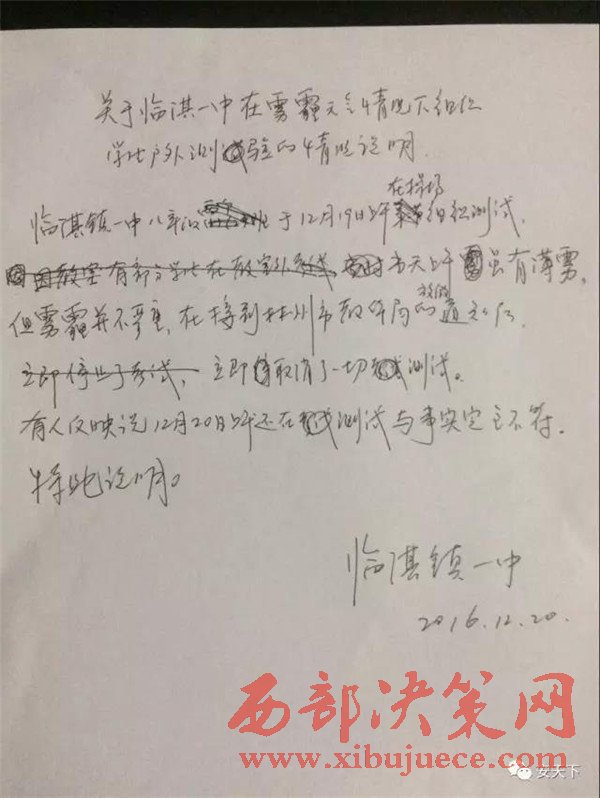 馮校長(zhǎng)出示了一份手寫(xiě)的情況說(shuō)明:臨淇鎮(zhèn)一中八年級(jí)于12月19日上午在操場(chǎng)組織測(cè)試,當(dāng)天上午雖有薄霧,但霧霾并不嚴(yán)重,在接到林州市教體局的通知后立即取消了一切測(cè)試。有人反映說(shuō)12月20日上午還在測(cè)試,與事實(shí)完全不符。特此說(shuō)明。“為什么有學(xué)生說(shuō)19日下午也考試了?”記者追問(wèn),并說(shuō)出了考試的科目。馮校長(zhǎng)尷尬地笑笑:“組織都組織了,就考完吧。”據(jù)馮校長(zhǎng)介紹,當(dāng)時(shí)并沒(méi)有這么多學(xué)生在操場(chǎng)考試,有一部分學(xué)生在教室考的,在操場(chǎng)上考試的只有480多名學(xué)生。到底是什么樣的考試如此急迫,讓學(xué)生頂著霧霾也要進(jìn)行?馮校長(zhǎng)說(shuō),學(xué)生課講完了,這次考試是一個(gè)摸底測(cè)驗(yàn)考試,也沒(méi)有那么急迫。