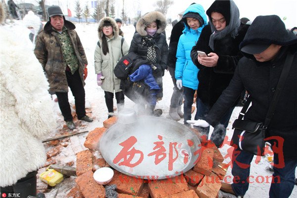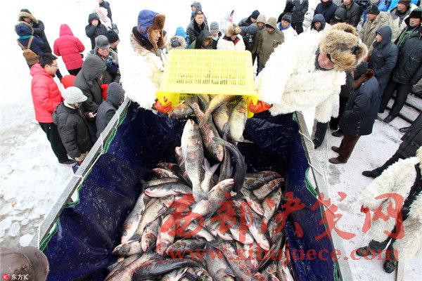 2016年12月25日,哈爾濱市長嶺湖舉行第三屆冬捕冬釣旅游節(jié)。現(xiàn)場(chǎng),漁民鑿開冰封的湖面,首網(wǎng)撈起萬余斤鮮魚,吸引了許多市民和游客前來觀看。冰面上支起大鍋,現(xiàn)場(chǎng)熬制鮮魚湯供人們品嘗。