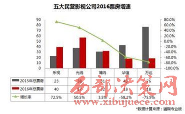 在單個(gè)公司增長(zhǎng)層面,樂視影業(yè)最為突出,2016年的票房增長(zhǎng)率達(dá)到了72.5%;光線影業(yè)2016年的票房增長(zhǎng)率達(dá)到35.9%,博納影業(yè)2016年的票房幾乎與去年持平,票房增長(zhǎng)率為3.5%;華誼兄弟影業(yè)2016年票房增長(zhǎng)率為-58.2%,萬達(dá)影視2016年的票房增長(zhǎng)率為-75.9%,票房波動(dòng)較大。