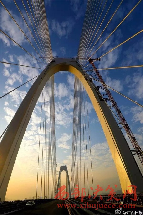 良慶大橋被譽(yù)為南寧的“金門大橋”,大橋的兩座主塔,由兩條主纜懸索連接起來,良慶大橋也是目前南寧市最大跨度雙索面懸索橋。