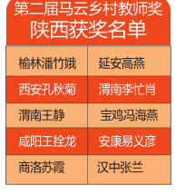 馬云公益基金會2016年6月15日公布第二屆馬云鄉(xiāng)村教師獎入圍名單,13省市區(qū)300位入圍老師中,陜西9地市有30人入圍。之后,13個(gè)省開始進(jìn)行各省初評,陜西省初評由三秦都市報(bào)全媒體組織,并采訪報(bào)道。經(jīng)過陜西初評、復(fù)評,以及全國復(fù)評。2017年1月5日晚,100位獲獎老師名單出爐,其中陜西有10位老師獲獎。首屆有陜西等6省參評,陜西有17位老師獲獎。