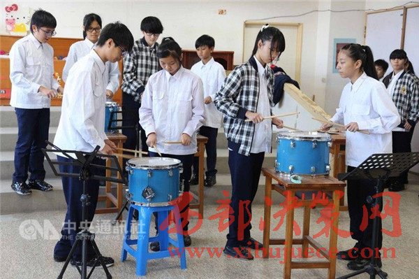 社團音樂老師趙純瓏說,打擊樂團有16名成員,原本是豎笛社團,但發(fā)現(xiàn)孩子們經(jīng)常隨著節(jié)奏拍打大腿或拍桌,非常活潑又具音樂天分,所以這學(xué)期才成立打擊樂團。