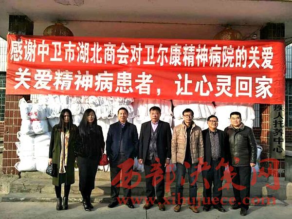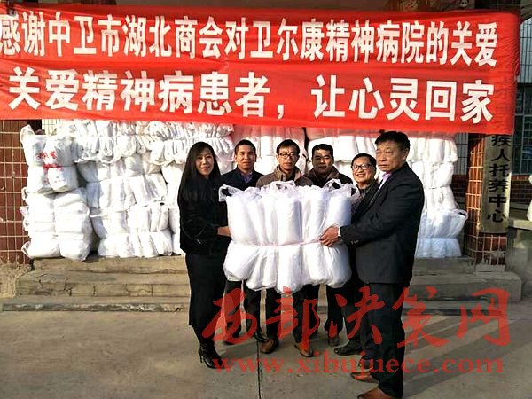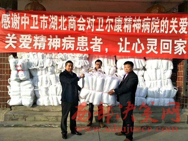 西部決策網(wǎng)訊(黃貞 楊新)2017年1月9日,中衛(wèi)市湖北商會一行數(shù)人在會長朱秀東的帶領(lǐng)下,前往中衛(wèi)市衛(wèi)爾康精神病醫(yī)院進(jìn)行新年前慰問,并送去價值2萬余元的過冬棉被。