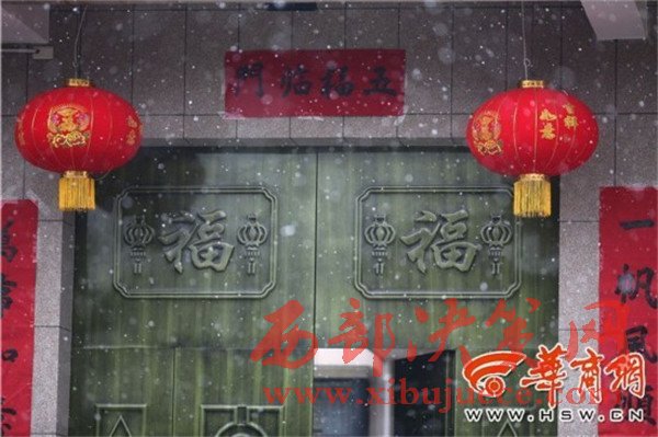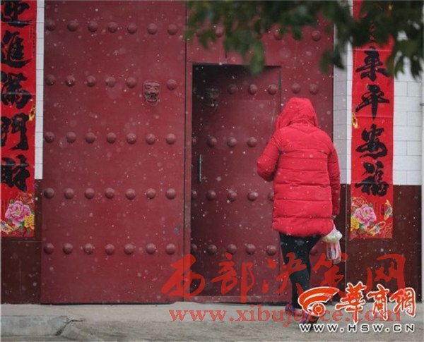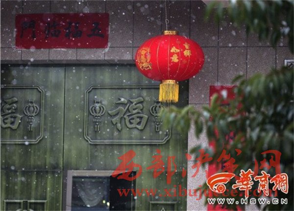 在高陵區(qū)一家農(nóng)戶門口,瑞雪與燈籠、對(duì)聯(lián)相應(yīng),也有了過(guò)年的氣氛。