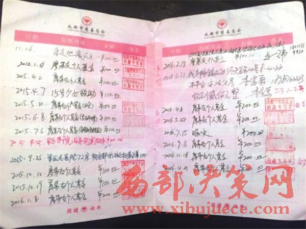從賑災(zāi)捐款,到為愛助醫(yī),從公眾熟知的“提燈女孩”王思培,到無人注意的早產(chǎn)雙胞胎,成都慈善總會為廖弟友發(fā)放的捐款證書上,每一頁都記著受助者的名字和個人基金的用途。翻看捐款證書,僅從2011年3月到2016年12月這段時間內(nèi),廖弟友的捐款次數(shù)達到58次,最近一次是2016年12月存入個人慈善基金的記錄。