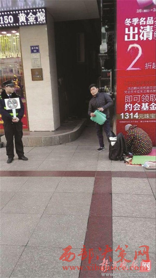 協(xié)管員舉牌,男子硬著頭皮繼續(xù)跪著乞討