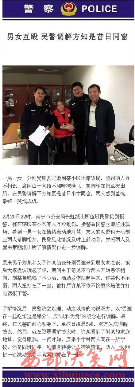 民警調(diào)解完結(jié)后有感而發(fā):“鳳嶺北苑,飲食男女;初,互不相識,受朋友之邀,推樽換盞,好不熱鬧。席間忘乎所以,惡語相向,施拳使腳齊飛,致長虹受令示警。調(diào)解畫押定論時,此女神情有異,問其故,疑男為昔日同窗。核,真如故,啼笑間,峰回路轉(zhuǎn),40年同窗偶遇,杰男俊女握手言歡!”