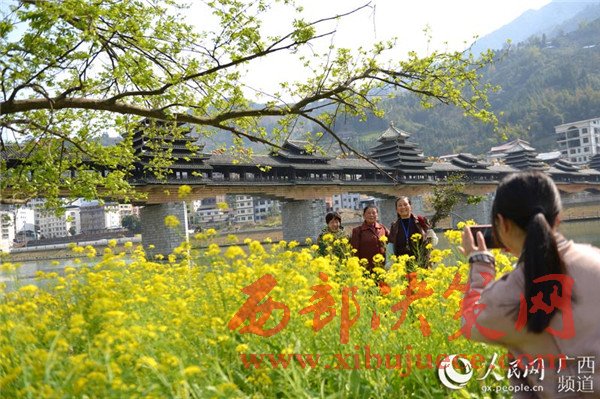 春暖花開時節(jié),廣西龍勝各族自治縣民族風(fēng)雨橋旁的油菜花競相綻放,風(fēng)雨橋在油菜花的點綴下美不勝收,形成了一道美麗的春天景致,充滿著濃郁的春天氣息,吸引眾多游客前來觀賞拍照。