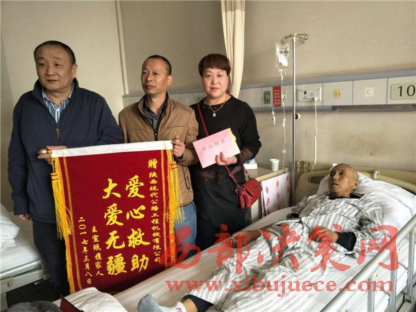 一方有難,八方支援,在王宣珉最困難最需要幫助的關(guān)鍵時刻,單位領(lǐng)導(dǎo)和職工伸出援助之手,給予他最大的鼓勵和支持。陜西現(xiàn)代公路工程機(jī)械有限公司總經(jīng)理張凌、副總經(jīng)理韓德光和工會主席杜三意受老總陳放委托代表全體員工在3月8日來看望慰問并給王宣珉捐款9350元。