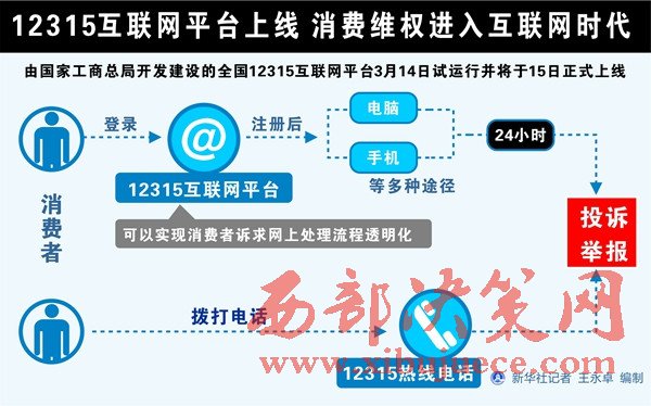 由國家工商總局開發(fā)建設(shè)的全國12315互聯(lián)網(wǎng)平臺14日試運(yùn)行并將于15日正式上線,消費(fèi)者在平臺上登錄注冊后可以通過電腦、手機(jī)等多種途徑24小時(shí)進(jìn)行投訴、舉報(bào)。