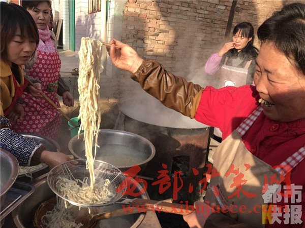 12月4日, 戶縣渭豐鎮(zhèn)元二村,村民們正在興高采烈的烹制著美味大餐,熱鬧非凡,頗有一種過(guò)大年的氣氛。熱氣騰騰的臊子面出鍋了,這第一碗面當(dāng)然要親手端給今天這場(chǎng)特殊宴會(huì)的主角——百歲老人段奶奶。