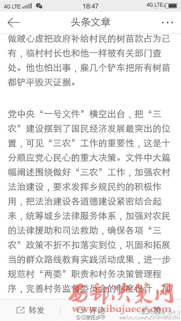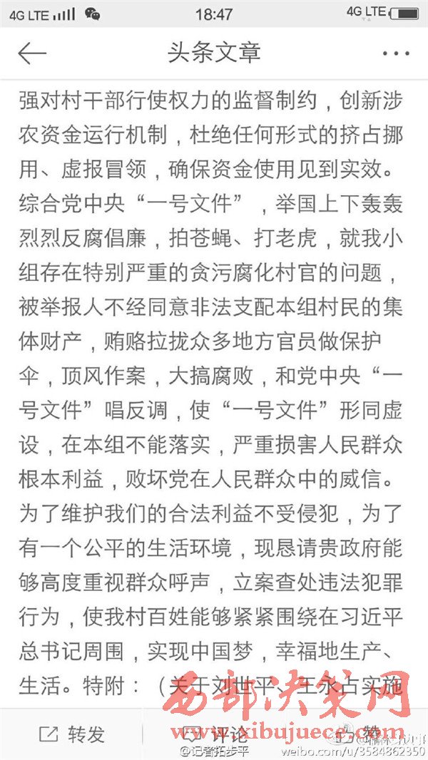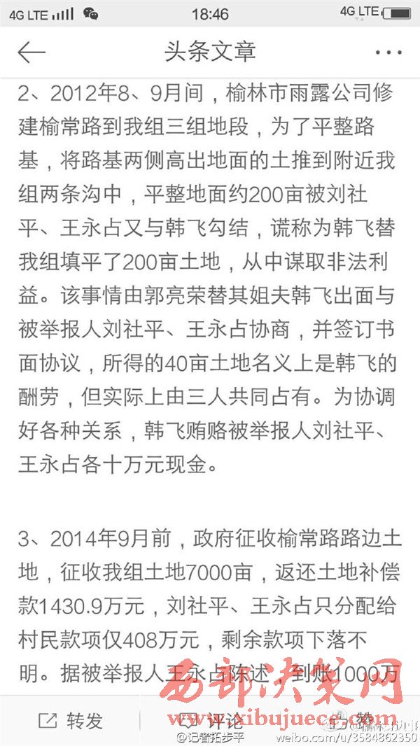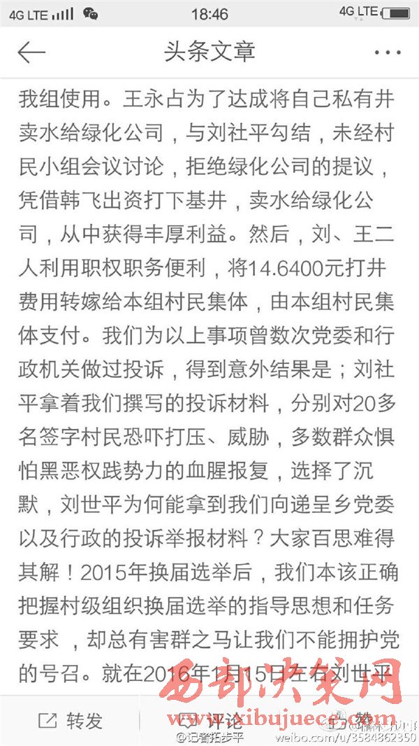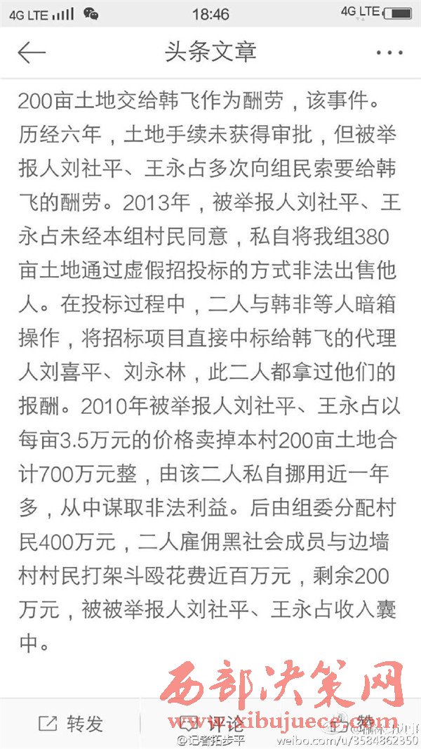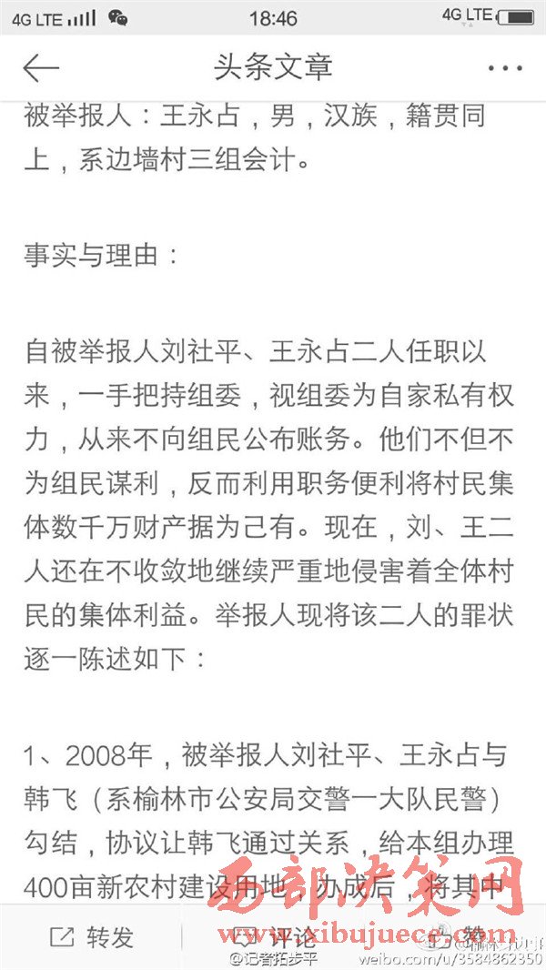 近日有微博網(wǎng)友飆新聞微博爆料:自被舉報(bào)人劉社平、王永占二人任職以來,一手把持組委,視組委為自家私有權(quán)力,從來不向組民公布賬務(wù)。他們不但不為組民謀利,反而利用職務(wù)便利將村民集體數(shù)千萬財(cái)產(chǎn)據(jù)為己有。請(qǐng)相關(guān)部門調(diào)查回復(fù)!