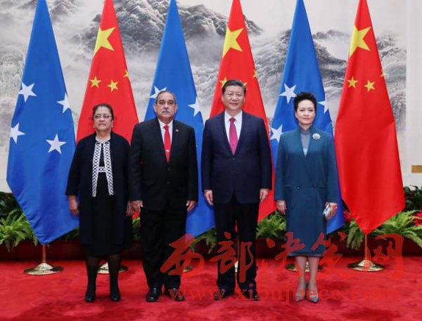 3月27日,國(guó)家主席習(xí)近平在北京人民大會(huì)堂同密克羅尼西亞聯(lián)邦總統(tǒng)克里斯琴舉行會(huì)談。會(huì)談前,習(xí)近平在人民大會(huì)堂東門外廣場(chǎng)為克里斯琴舉行歡迎儀式。這是習(xí)近平和夫人彭麗媛同克里斯琴總統(tǒng)夫婦合影。