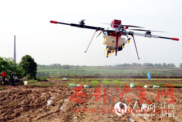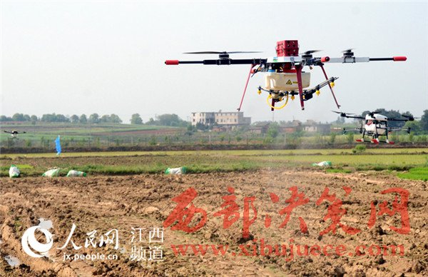 4月18日,江西省奉新縣宋埠鎮(zhèn)橋頭村奉新縣建華農機合作社的稻田上空,數(shù)架無人機正在“嗡嗡”作業(yè),農技員正在展示植保無人機噴灑農藥的功能。