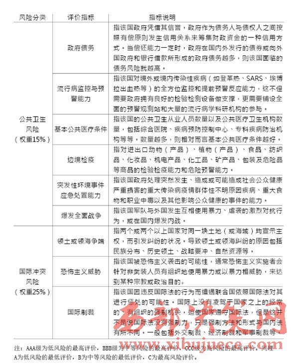 就目前階段而言,我們認(rèn)為應(yīng)當(dāng)加入兩個(gè)綜合評(píng)價(jià)指標(biāo)來統(tǒng)合“政治風(fēng)險(xiǎn)”“經(jīng)濟(jì)風(fēng)險(xiǎn)”“公共衛(wèi)生風(fēng)險(xiǎn)”和“國(guó)際沖突風(fēng)險(xiǎn)”。第一個(gè)綜合指標(biāo)用以統(tǒng)合4個(gè)二級(jí)指標(biāo),反映同一類型的風(fēng)險(xiǎn)相互轉(zhuǎn)化、相互疊加或相互影響的程度;第二個(gè)綜合指標(biāo)用以統(tǒng)合4個(gè)一級(jí)指標(biāo),反映不同類型的風(fēng)險(xiǎn)相互轉(zhuǎn)化、相互干擾或相互堆扎的程度。