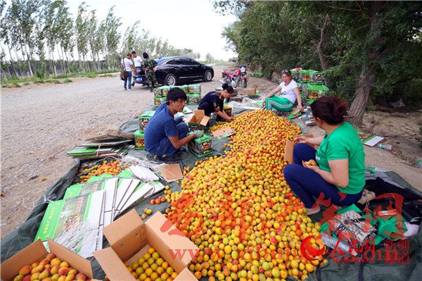 走進周振峰的杏院子,紅彤彤的杏子已經壓彎了枝頭,大家正在緊張采摘。在杏園外,從烏魯木齊來的客商買買提·吐爾遜也和自己的員工一起挑揀品質較好的杏子進行包裝。他告訴筆者,因為托克遜的杏子每年都比其他地方成熟的要早,所以他每年都要來托克遜收購杏子,每年最少收購400噸。