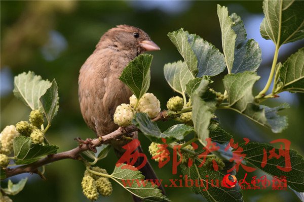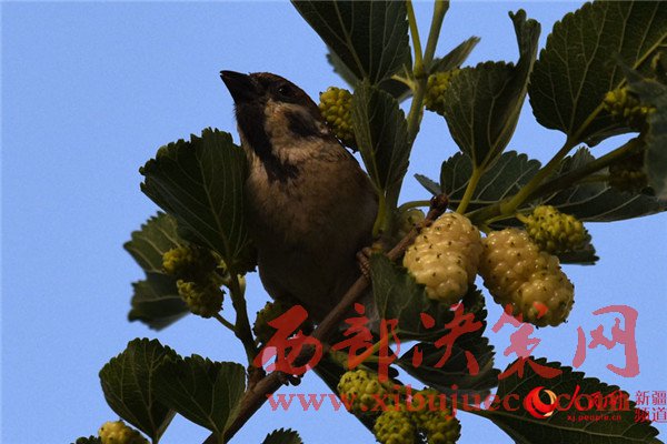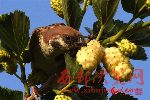 5月25日清晨,在新疆庫爾勒市一家住宅小區(qū),一只麻雀在吃桑葚。每年的5月底是新疆庫爾勒地區(qū)白、紅、黑三色桑葚熟透的季節(jié)。目前,三色桑葚已經(jīng)在新疆庫爾勒市大量上市,吸引市民爭相購買品嘗。