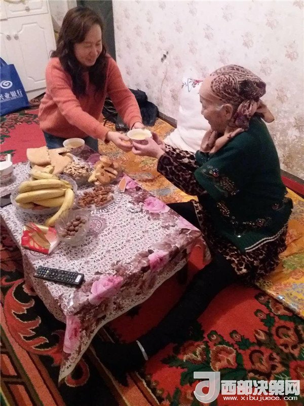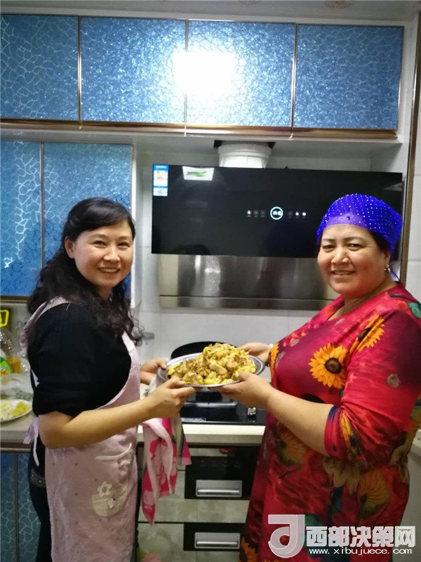艾來提·賽買提的父親賽買提·阿合買提一面接過韓莉書記手里的米、面、清油和兩大兜食材,一面心疼地埋怨:“這么冷的天,你們又拿這么多東西,多辛苦,你上次送來的東西還沒有吃完呢。”韓莉和王艷萍笑而不語,心里默默地盤算著帶給親戚意外的驚喜。因為艾來提·賽買提和愛人長期兩地分居,聚少離多。今天正好是他們父母結(jié)婚三十周年紀念日,她們?nèi)嗽缇蜕塘亢靡欢ㄒH手做一頓飯,邀請這個民族團結(jié)大院里附近的同事和各自的親戚一起來給這個小家庭舉辦一場別開生面的大融合聚會,她們忙碌著,擇、洗、炒,撲鼻的香味彌漫在親戚的家中……
