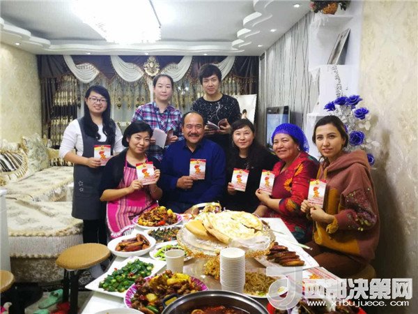 傍晚,一大群來自不同民族,不同單位的新疆兒女聚在了一起,紛紛加入到這個民族團結(jié)的大聚會里,彈一首歡快悅耳的冬不拉,舞一曲深情優(yōu)美的賽乃姆,唱一首民族團結(jié)的贊歌,將整個聚會推向高潮。賽買提·阿合買提高興地說:“我今天太開心了!這個結(jié)婚紀念日太有意義了,你的親戚,我的親戚,變成了我們的親戚,以后這就是你們的家,你們要經(jīng)常來啊!” 趁著大家都在興頭上,韓莉書記又拿出學校專門印制的《不忘初心 牢記使命-黨的十九大精神進校園讀本》,熱情地為親戚們宣傳起十九大精神,給大家講起黨的好政策來。在得知艾來提·賽買提目前還沒有找到合適的工作,沒有穩(wěn)定收入的情況后,大家立刻表示愿意幫助他早日找到合適的工作,幫助他們解決最實際的困難,把溫暖送到他們的心坎中。大家唱唱跳跳,說說笑笑,其樂融融,在互幫互助中讓民族團結(jié)之花越開越艷。