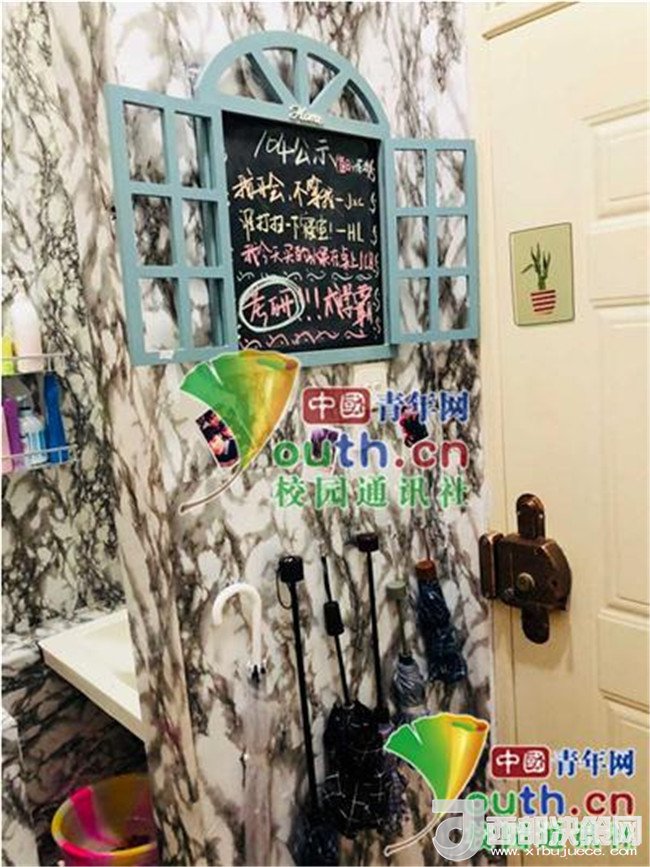 記者了解到,華麗變身后的宿舍,除了效果讓人驚艷不已外,還有許多小細(xì)節(jié)同樣讓人覺得很暖心。在門口處有一個(gè)小黑板,上面寫著室友的留言和一些鼓勵(lì)的話語;進(jìn)門的地方專門騰出一塊空間,放雨傘、鑰匙等一些物品。