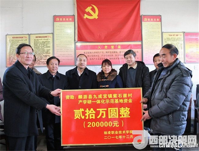 12月15日,為為貫徹落實(shí) 《全省脫貧攻堅 2017冬季行動方案》精神,扎實(shí)推進(jìn)高校結(jié)對幫扶“雙百工程”,有效地為當(dāng)?shù)靥厣a(chǎn)業(yè)服務(wù),楊凌職業(yè)技術(shù)學(xué)院黨委書記趙曼、黨委副書記任得元一行來到麟游縣九成宮鎮(zhèn)紫石崖村,為該村捐贈20萬元,用于建立中蜂養(yǎng)殖產(chǎn)學(xué)研一體化示范基地、核桃豐產(chǎn)栽培產(chǎn)學(xué)研一體化示范基地及電商網(wǎng)絡(luò)平臺。