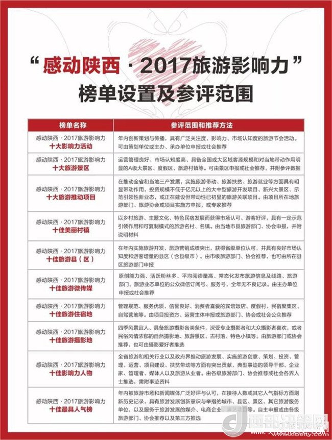 “感動(dòng)陜西·2017旅游影響力”大型評選活動(dòng),既是對2017年陜西旅游業(yè)的綜合評估和優(yōu)勢品牌項(xiàng)目的一次集中梳理和聯(lián)動(dòng)推廣,評選活動(dòng)設(shè)置了2017年“十大影響力活動(dòng)”、“十大旅游景區(qū)”、“十大旅游推動(dòng)力項(xiàng)目”、“十佳美麗村鎮(zhèn)”、“十佳旅游縣(區(qū))”、“十佳旅游微傳媒”、“十佳旅游住宿地”、“十佳旅游攝影地”、“十佳影響力人物”、“十佳最具人氣榜”10類項(xiàng)目,采取社會(huì)推薦、自主申報(bào)、專業(yè)推選、游客調(diào)查、網(wǎng)民評選、社會(huì)公示、大眾點(diǎn)評、數(shù)據(jù)分析等方法得出評選結(jié)果,于2018年1月通過大型盛典對外公布,使其成為載入史冊的2017年度陜西旅游業(yè)優(yōu)勢品牌榜單。